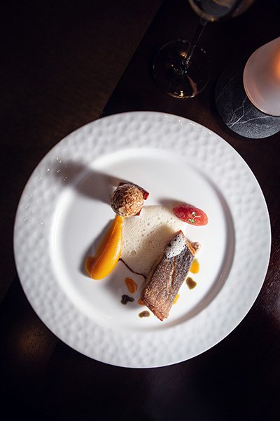 สำหรับคอร์สที่สาม จะเป็นเมนูเนื้อปลา Dover sole truffled chermoula เนื้อปลา Dover Sole ซูวีจนได้เนื้อที่นุ่ม เสิร์ฟคู่กับซูกินี่และ truffled chermoula ส่วนใครที่ชอบทานสเต๊กปลา สามารถเลือกสั่ง Pan – roasted sea bass เนื้อปลา Spanish sea bass ย่างบนกระทะ เสิร์ฟคู่กับฟักทองอบ ไส้กรอกซอริโซ่ มะเขือเทศกงฟีร์ และขิง